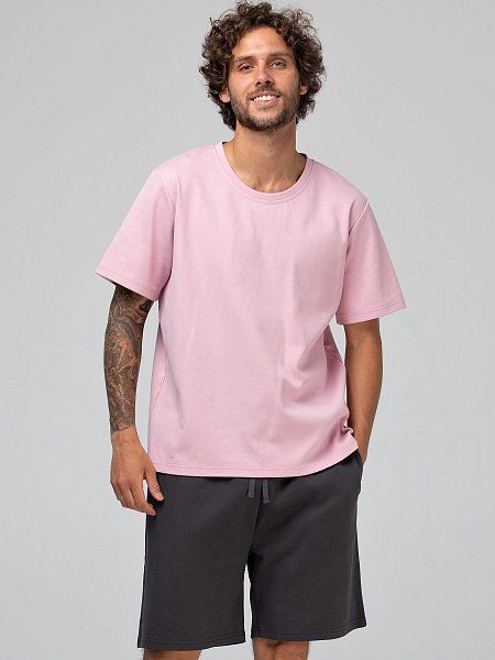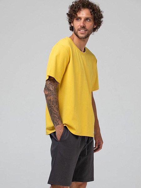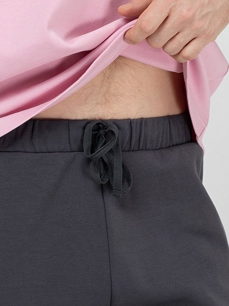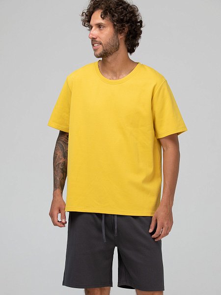 Мужской костюм для дома и отдыха: футболка и шорты. Выполнен из плотного хлопкового трикотажа в диагональный рубчик. Шорты до колена или чуть выше, свободного кроя, на резинке с кулиской и шнурком. Имеют удобные боковые карманы. Держат форму и не просвечивают. К серым шортам есть три варианта расцветки футболок: желтая, розовая, голубая. Оттенки спокойные, приглушенные, способствующие расслабленному времяпровождению. Футболка свободного прямого силуэта, с коротким рукавом и округлым вырезом горловины. Этот комплект удовлетворит самый взыскательный вкус и поможет создать стильный и комфортный образ для дома и отдыха.