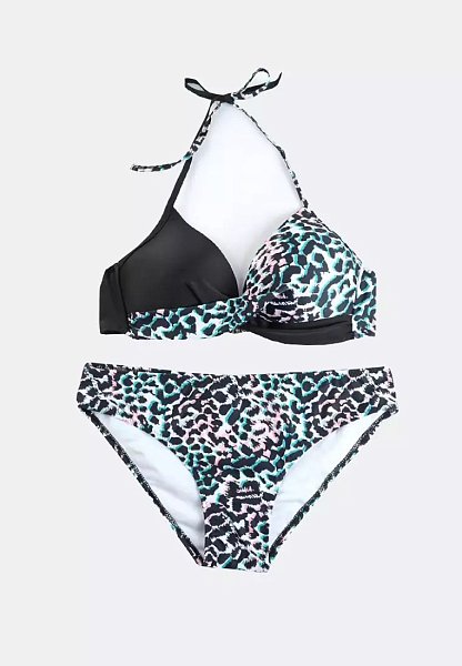 Раздельный купальник с анималистическим принтом и цветными пятнышками. Купальник выполнен из мягкого, быстро сохнущего полотна с принтом. Состоит из бюстгальтера и трусов. Бюстгальтер с формованными чашками без косточек. Обеспечивает комфортную, мягкую посадку. Бретели завязываются вокруг шеи. Застёжка сзади. Трусы средней посадки. В комплекте: лиф, плавки.