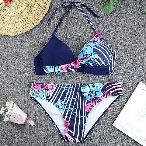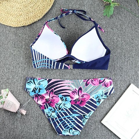 Синий раздельный купальник с принтом в виде орхидей. Купальник выполнен из мягкого, быстро сохнущего полотна с принтом. Состоит из бюстгальтера и трусов. Бюстгальтер с формованными чашками без косточек. Обеспечивает комфортную, мягкую посадку. Бретели завязываются вокруг шеи. Застёжка сзади. Трусы средней посадки. В комплекте: лиф, плавки.